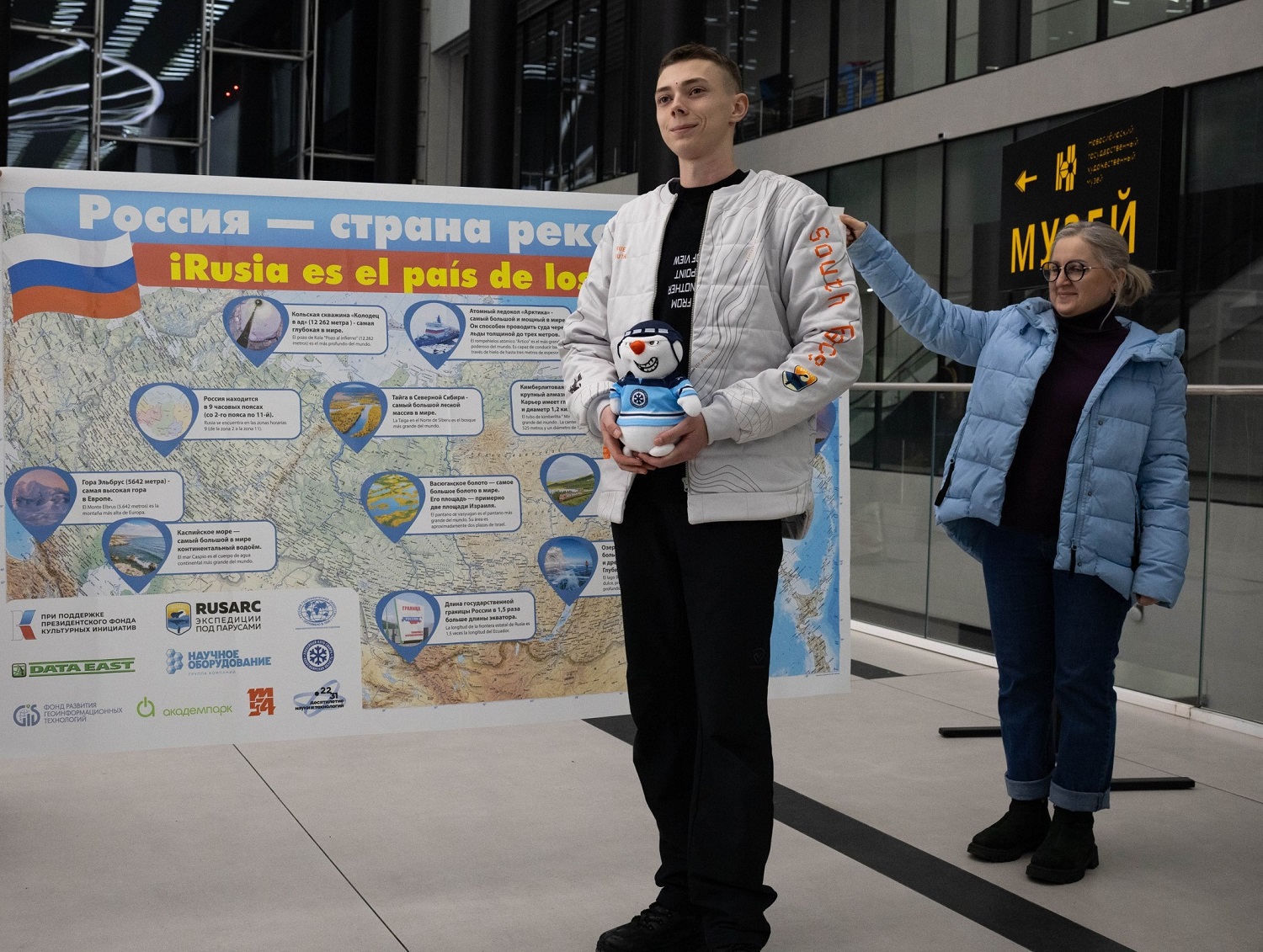 Проводить ребят в интереснейшее приключение пришли не только талисманы КХЛ, хоккейных клубов «Сибирь», «Сибирские снайперы» и «Трактор». Известные путешественники, наставники «Кинолаборатории для школьников», члены Русского географического общества дали свои напутствия и пожелали ярких встреч и открытий. Заслуженный путешественник России, член РГО, побывавшая на всех континентах, Ольга Маслобоева сопроводит школьников в Аргентину, где их ждет дипломатическая работа – общение со сверстниками, рассказы о России и ее географических рекордах. С собой Антон Обершов и Анна Тихонова везут постер на русском и испанском языках, который представляет нашу страну удивительной и неповторимой – с глубочайшим озером Байкал, загадочными Васюганскими болотами и бескрайним хвойным океаном тайги, полюсом холода Оймякон, высочайшей горой в Европе - Эльбрусом, самым мощным атомным ледоколом «Арктика», самой длиной железной дорогой мира в масштабах одной страны Транссибирской магистралью, самой умной улицей мира в Новосибирском Академгородке и другими рекордами, которыми стоит гордиться.